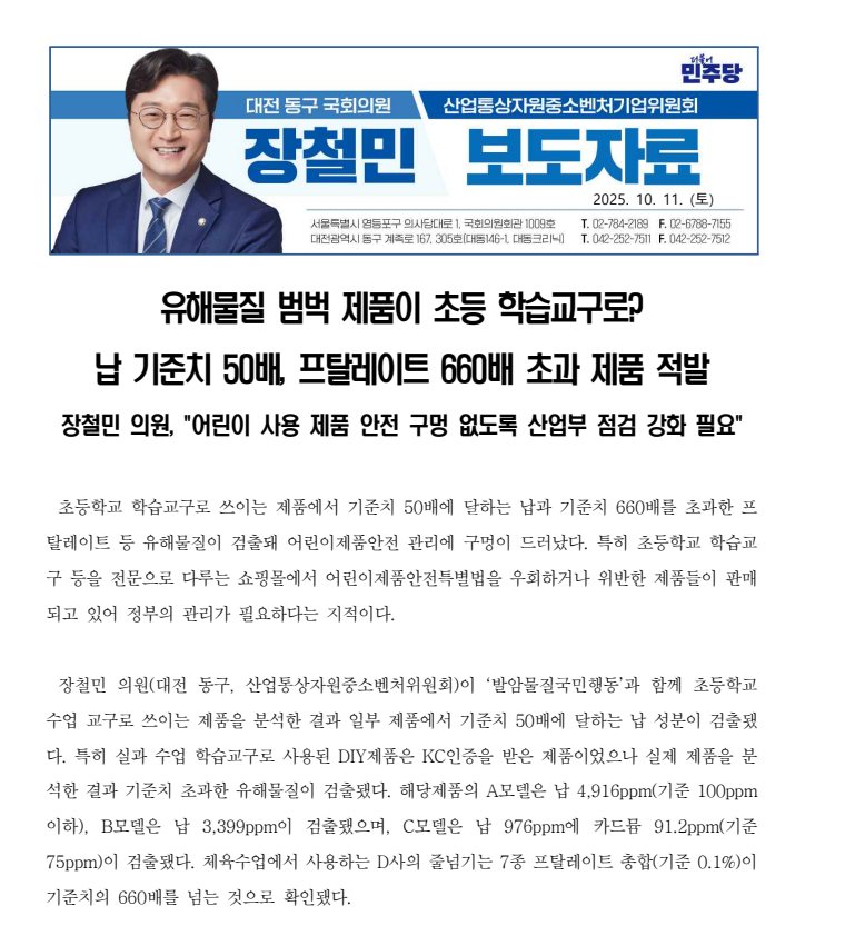유해물질 범벅 제품이 초등 학습교구로? 납 기준치 50배, 프탈레이트 660배 초과 제품 적발장철민 의원, “어린이