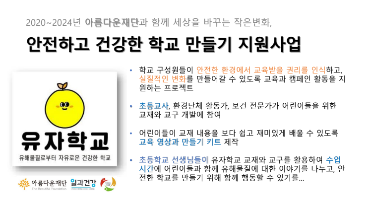 발암행동은 건립 초기부터 PVC로부터 안전한 학교 만들기를 시작으로 2020-2024년 아름다운 재단과 함께 유해물질로부터 자유로운 건강한 학교 ‘유자학교’ 캠페인을 펼쳐 왔습니다. 유자학교는 학교 구성원들이 안전한 환경에서 교육 받을 권리를 인식하고 실질적인 변화를 만들어가는 교육 캠페인 활동으로 초등학교 현직 교사들이 참여하였습니다.
