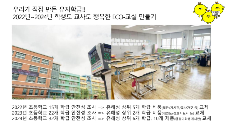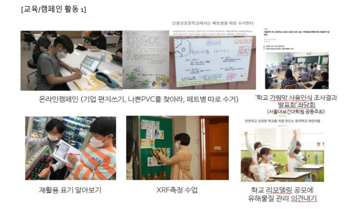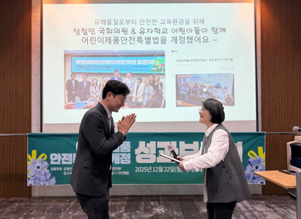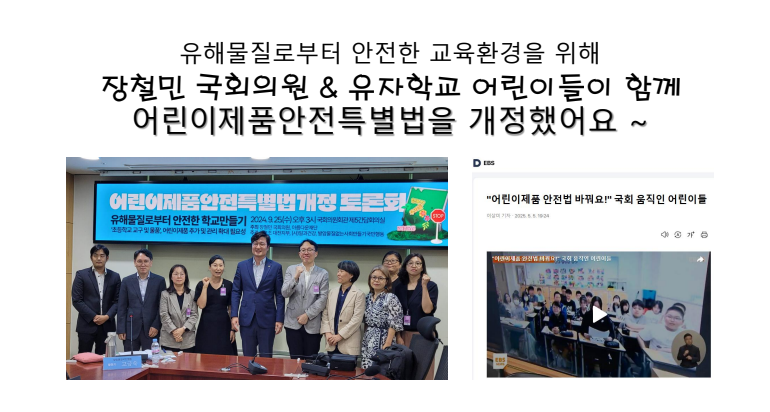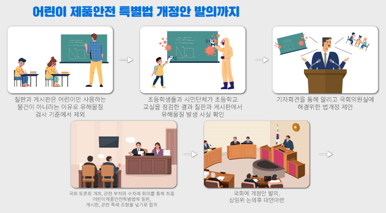 학교 칠판과 게시판에서 유해물질이 검출되었고, 이 사실을 알리는 과정에서 장철민 국회의원실과 연락이 닿았습니다. 국회 토론회 진행과 관련 부처와 수차례 회의 끝에 어린이 제품 안전 특별법에 칠판, 게시판의 유해물질 관리가 들어가게 되었습니다.