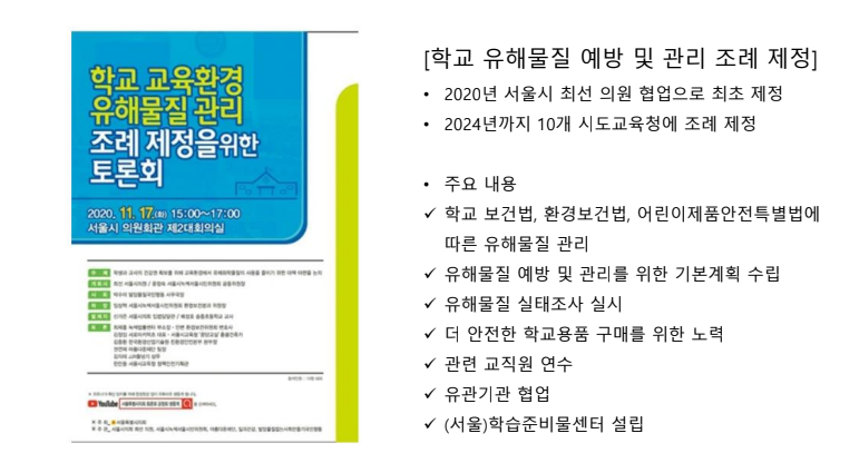 교육현장에서 이뤄지는 활동 이외에 제도적인 변화를 만들기 위해 노력해왔습니다. 그 일환으로 학교 교육환경 유해물질 관리 조례 제정 운동을 시작해 2024년까지 전국 10개 시도 교육청에 조례를 제정하는 변화를 만들었습니다.