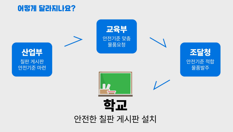 법 개정으로 아래와 같이 일부 제품에서 유해물질이 발견되었던 학교 게시판과 칠판의 안전 기준이 강화되었습니다. 어린이들이 숨쉬고 생활하고 만지는 제품이 안전하게 변하게 된 것이지요.