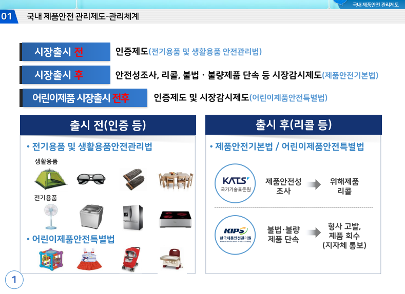 국내 제품안전 관리제도는 시장 출시 전 ‘전기용품 및 생활용품 안전관리법’을 통해 품질을 관리하고, 시장 출시 후에는 ‘제품안전기본법’과 ‘어린이제품안전특별법’을 통해 리콜 등을 실시하는 등 조치를 취합니다.