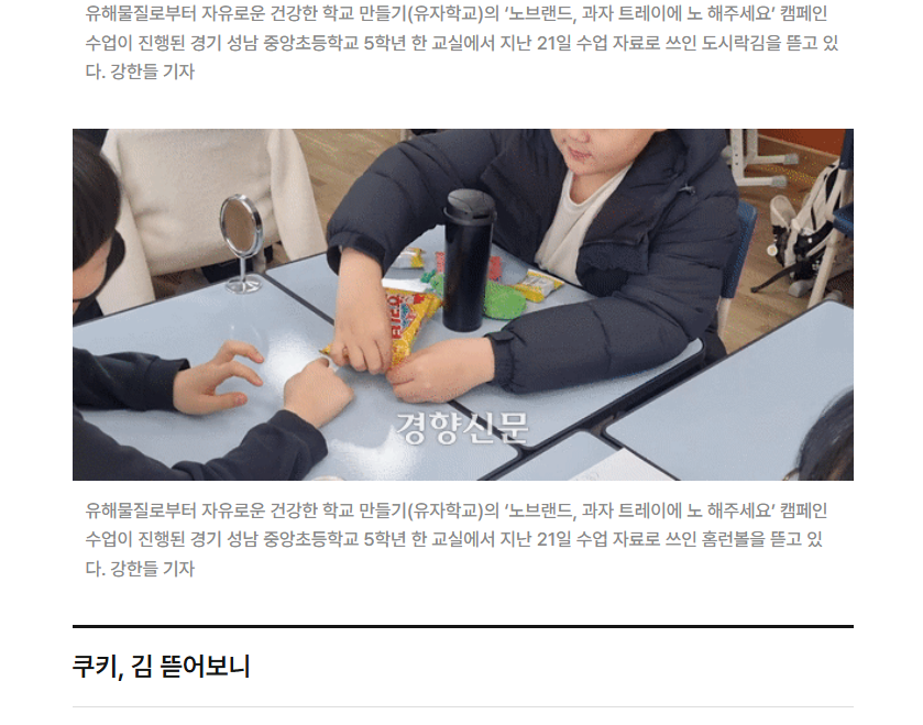 어린이들이 좋아하는 과자를 직접 먹고 벗겨가면서 플라스틱 포장재를 토론하는 시간을 갖고 대안을 고민하는데요. 2023년 경향신문에 유자학교의 이러한 수업 내용이 실린 적도 있어요.
