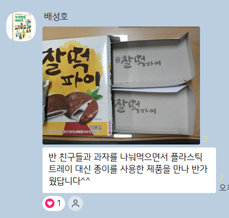 2023년부터 유자학교에서는 ‘과자 파티’를 하면서 플라스틱 쓰레기 문제를 공부하는 시간을 보내며, 종이 트레이 제품으로 교체하지 않은 노브랜드에 계속해서 편지를 써오고 있답니다. 노브랜드는 아무리 편지를 보내도 답이 없지만! 올해 오리온에서는 아래와 같이 과자 선물과 편지를 보내주셨어요.