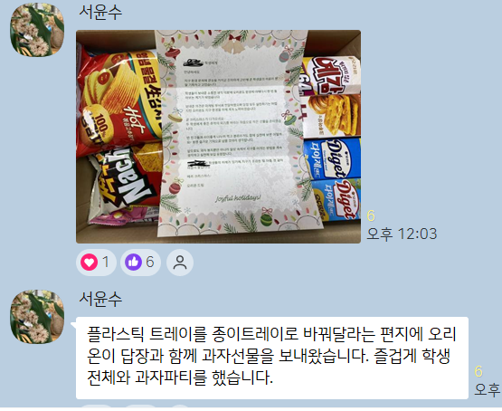 오리온은 마케팅 팀에 전달하여 포장지를 줄이도록 노력하겠다면서, 크리스마스 선물로 오리온 과자를 선물해주셨습니다. 크리스마스에 이브에 딱 맞춤인 따뜻하고 다정한 뉴스를 유자학교에서 보내드려요:)